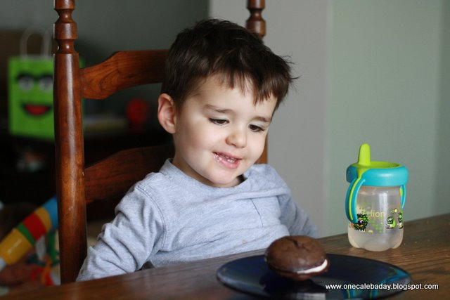Caleb determining how to approach the eating of his first Whoopie Pie.