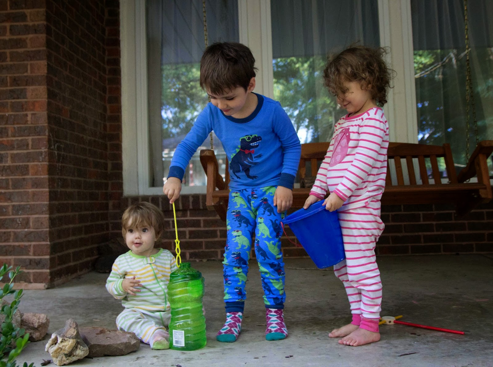 The three of them had a good game going: Caleb blew bubbles, Daisy attempted to catch the bubbles in her bucket, and Lily sat and smiled. That's what I call teamwork.