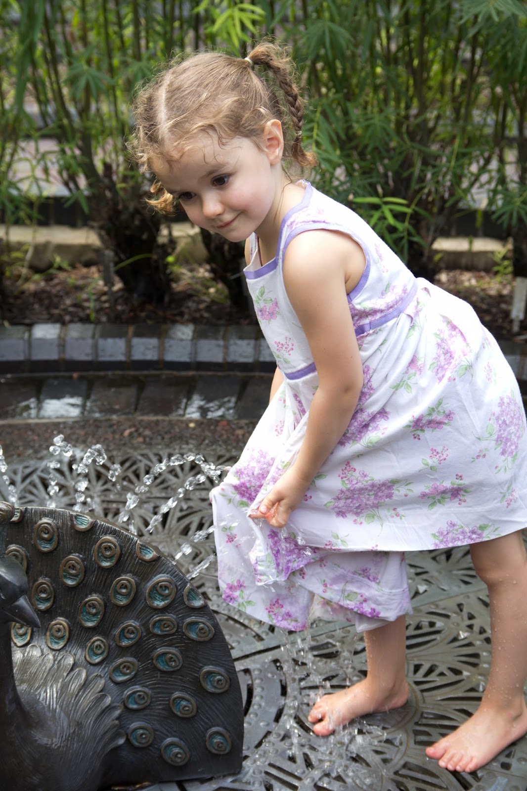 Then we explored a new-to-us part of the Garden: a hidden children's garden, complete with fairy houses, wire fairies, and a peacock fountain, perfect for splashing. Daisy wasted no time in getting completely soaked.