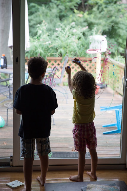 Eli wanted so badly to participate in the window drawing, but I just couldn't take the risk of him drawing all over everything. These "crayons" are more like grease pencils or oil pastels. Really messy.